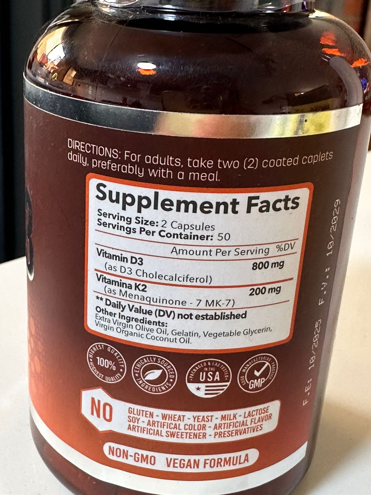 Salud cardiovascular: La vitamina K2 previene la acumulación de calcio en las arterias, reduciendo el riesgo de arteriosclerosis, una condición que afecta la flexibilidad y función de las arterias. Optimización del sistema inmunológico: La vitamina D3 juega un papel crucial en la respuesta inmune, ayudando al cuerpo a combatir infecciones y reduciendo el riesgo de enfermedades autoinmunes. Soporte muscular y dental: La sinergia de D3 y K2 ayuda a mantener la salud de los músculos y los dientes, que también dependen del calcio adecuado en su estructura. Ventajas 120 porciones de vitamina K2 + D3 en cada botella Ayuda en la activación de la matriz GLA, una proteína que ayuda a prevenir la acumulación de calcio 100 MCG de vitamina K2 (mk7) y 5000 IU de vitamina D3 en cada porción Sin OMG y sin gluten Fabricado en una instalación compatible con GMP, registrada en la FDA Este producto sólo está destinado a ser consumido por personas saludables de 18 años de edad o mayores. Consulta a tu médico antes de usar si estás embarazada o en lactancia. No exceder el uso recomendado. El uso inadecuado no mejora los resultados y no se recomienda. Mantener fuera del alcance de los niños. Almacenar en un lugar fresco y seco. No utilizar si el sello de seguridad está roto. Ingredientes Vitamin D3, Vitamin K2 (MK7), Como suplemento dietético, tomar 1 – 2 cápsulas de gel al día, preferiblemente con alimentos. O como lo indique su médico.